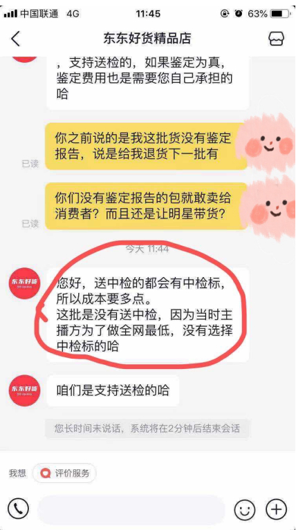 新浪财经联系了东东好货一位陈姓售后工作人员,他表示,这批直播间的货因为成本控制原因,没有匹配相应的检测报告,“用户如果对包的真假存疑,可以送去中检机构进行检测,如果检测为假,那我们根据平台的规则怎么处理都行。”