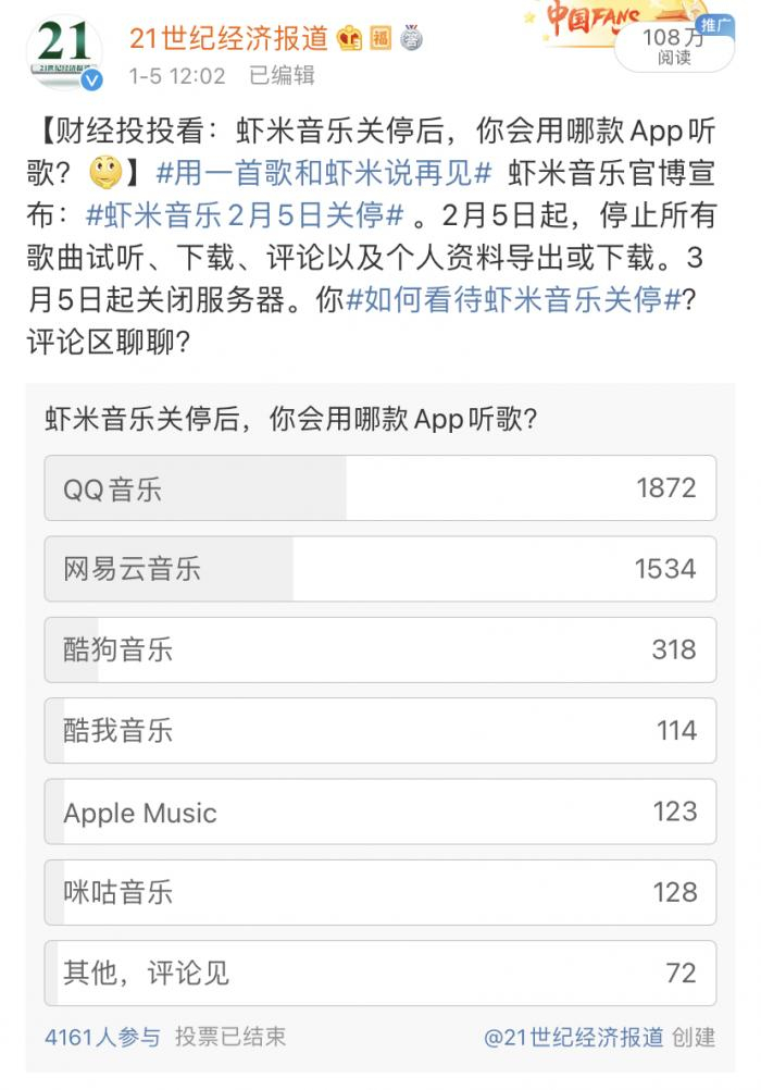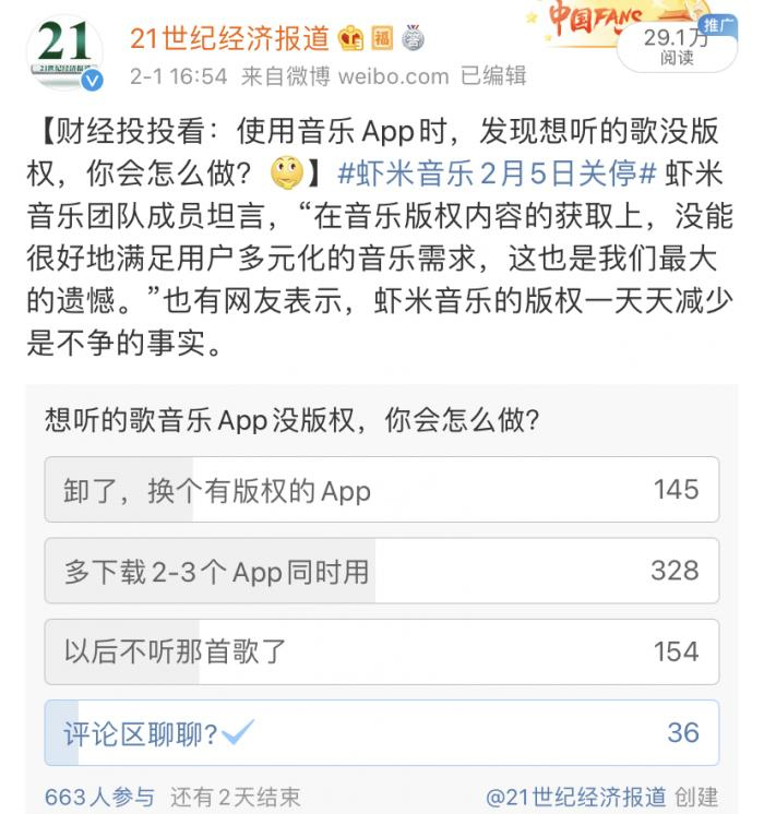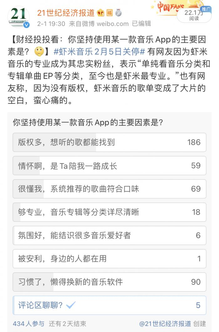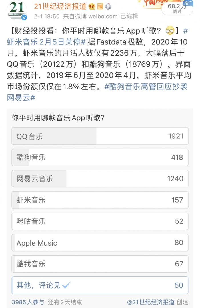 有网友在投票下方评论,“虾米是最好的”,也有人表示两千多万的月活不算低了。此前,虾米音乐官方微博发布关停公告后,也有粉丝留言称“找不到比虾米更好的音乐App”。