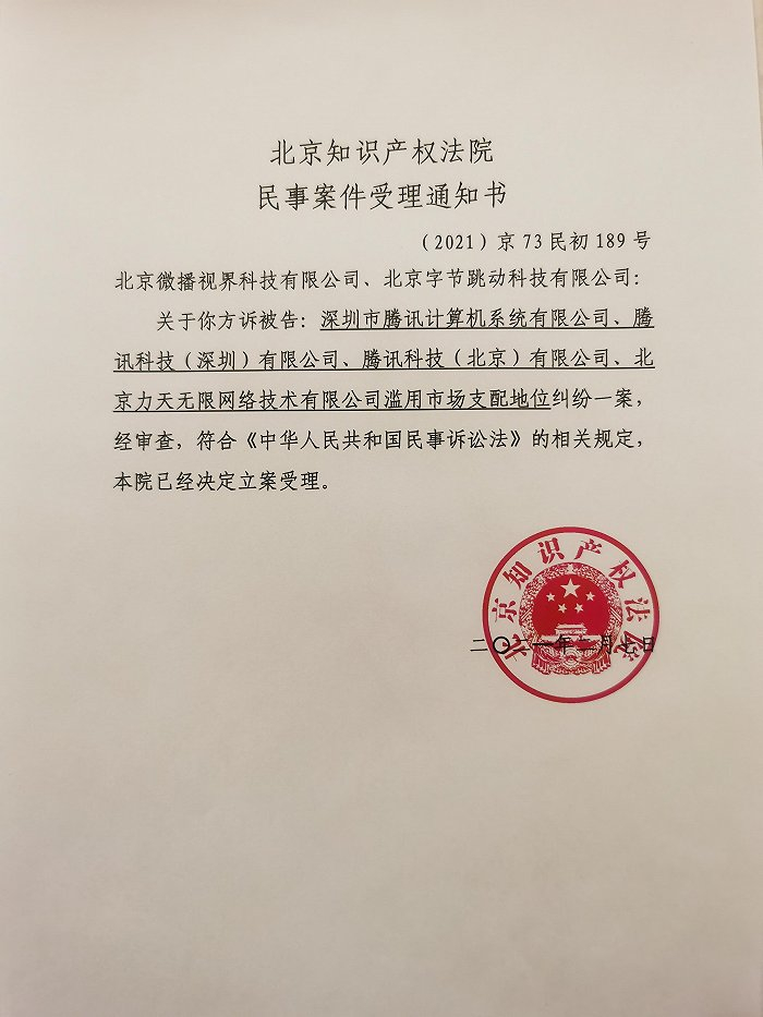 原标题:抖音诉腾讯最新进展:互联网平台反垄断第一案正式立案