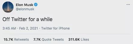 2月2日,推特大户马斯克,在推特上发了一条推文,“off Twitter for a while” (离开推特一阵子),美国网友迅速吃瓜,纷纷好奇钢铁侠去往何方。
