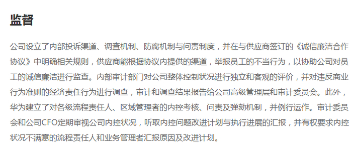 据华为官网,公司设立了内部投诉渠道、调查机制、防腐机制与问责制度,并在与供应商签订的《诚信廉洁合作协议》中明确相关规则,供应商能根据协议内提供的渠道,举报员工的不当行为,以协助公司对员工的诚信廉洁进行监查。