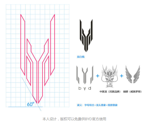 知乎网友为比亚迪设计的车标,并注明版权可供BYD官方免费使用。/知乎@白格