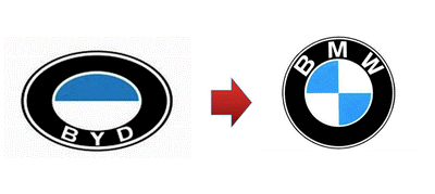 后来比亚迪收购秦川汽车,进军汽车业“行不更名,坐不改姓”沿用了原来的名字。这土洋结合的风格仿佛刻在了比亚迪的基因里。从最开始的蓝天白云车标,相似的配色,纯属巧合的雷同,撞脸“宝马”车标。