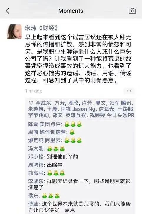 该聊天记录的截图被发到网上,引发了轩然大波,宋玮在微信朋友圈进行了澄清,表示:非常愤怒和可笑,并称这完全是凭空捏造。