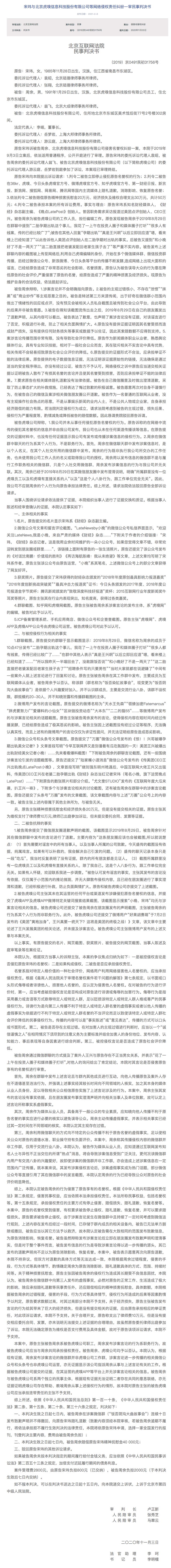 2月8日,北京互联网法院公布了《宋玮与北京虎嗅信息科技股份有限公司等网络侵权责任纠纷一审民事判决书》。