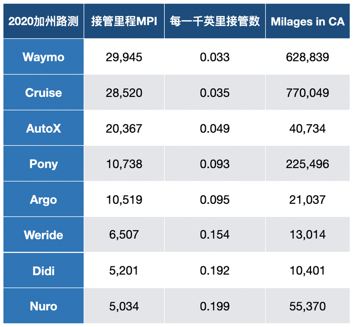 今年最新数据显示,位列前三名的Waymo、Cruise、AutoX的三家自动驾驶公司的MPI值均在2万至3万英里之间,即3万至5万公里;第四、五名Pony和Argo的MPI值均在1万英里左右,第五名至第十名公司的MPI接管里程在数千英里级别。