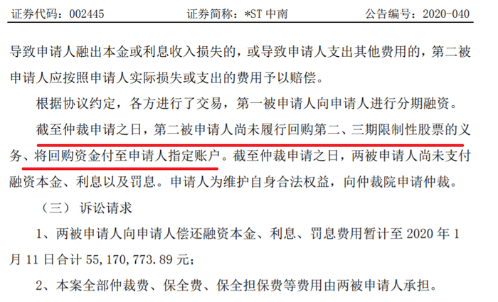 雪上加霜的是,国信证券一度申请仲裁仲裁,要求18名高管(第一被申请人)和中南重工(第二被申请人)偿还融资本金、利息、罚息费用合计5517.08万元(截至2020年1月11日)。