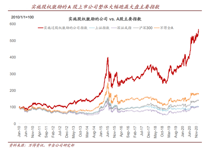 中金公司曾做过一项统计,发现2010年以来,那些实施过股权激励的A股上市公司整体跑赢了指数。