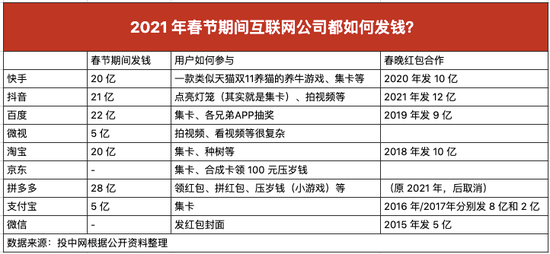 自此之后,为争夺春晚红包的合作机会,互联网公司都愿意广撒钱。过去五年间,依次与春晚红包合作的分别有:支付宝、淘宝、百度、快手。它们通过发红包互动方式增加用户规模,比如2019年百度日活从1.6亿冲上3亿、2020年快手完成了DAU到3亿的KPI。这个期间,不仅合作的主APP收益,它还携带“全家桶”的业务集中在此聚光灯下:要拿更多红包,先下载我其他的APP。