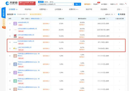 天眼查大数据显示,北京光线影业有限公司由北京光线传媒股份有限公司100%持股,后者的十大股东包括杭州阿里创业投资有限公司及美团系公司——上海汉涛信息咨询有限公司。