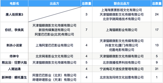 相较于网易和B站,字节跳动则通过字跳网络、抖音文化和微播世界分别参与了《唐人街探案3》、《刺杀小说家》和《熊出没:狂野大陆》3部影片的联合出品。