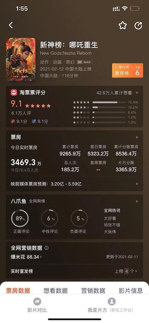 然而相较于《白蛇·缘起》的口碑逆袭,《新神榜:哪吒重生》目前的表现稍显逊色。在一众大片的包围下,首日票房仅为5323.2万元,多方给出的票房预期也在3.2-5.59亿元之间。