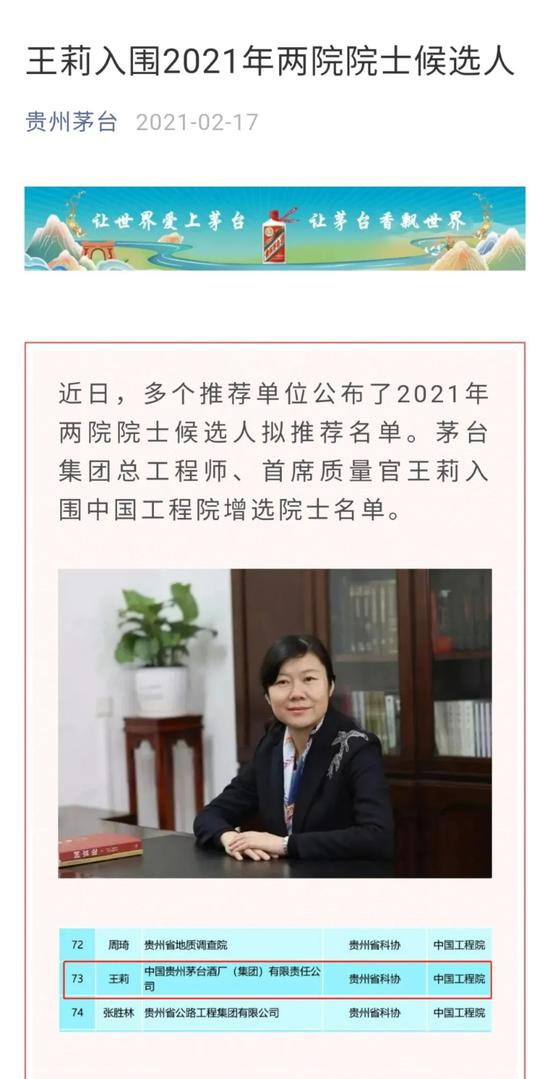 2月17日,贵州茅台微信号发布消息称,茅台集团总工程师、首席质量官王莉入围中国工程院增选院士名单。
