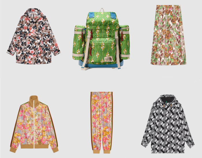 还有The North Face(北面) x Gucci系列。我的第一反应就是去奶奶的衣柜里翻同款棉袄,顺便跟刘老根炕上的大花被比比哪个更花哨。