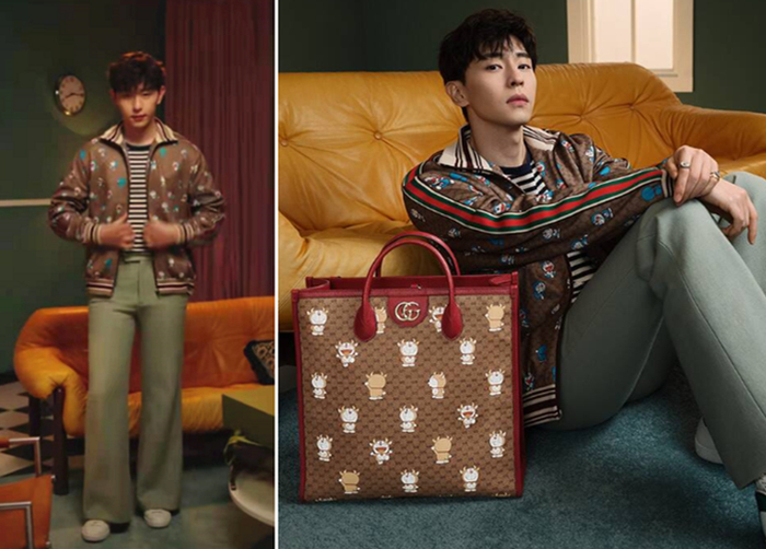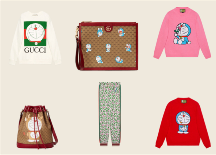 这是Doraemon(哆啦A梦) x Gucci联名款。谈不上难看,但总归有点糊弄。蓝胖子简单粗暴地“贴”在衣服和包上,一副就是不想好好设计的既视感……