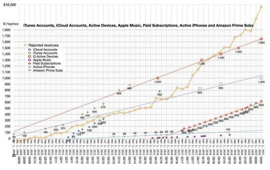 服务业务大有代替iPhone成为新摇钱树之势,从统计数据可以看出,其中尤其是付费订阅和Apple Music的增幅,为苹果的营收带来了几何级别的增长。