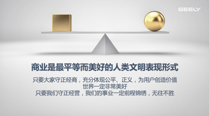 吉利控股集团及其它各业务集团也一样,股权可以增减,资本可以进退,但企业必须做实做强,形成管理层、全体员工共享企业经营成果的主人翁文化,保证企业长期可持续发展。这既是对企业负责,也是对社会负责,更是关系到全体员工的切身利益。要实现以上这些目标,企业治理必须现代化,所有权、经营权就必须分开,这是应对未来挑战的有效法宝。