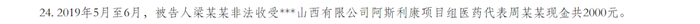 根据起诉书,2019年5月到6月,某山西有限公司阿斯利康项目组代表周某某,向梁晓行贿现金2000元。