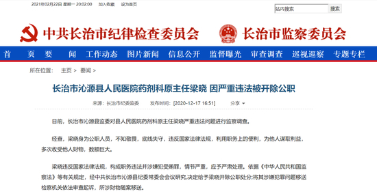 而在此之前的2020年12月17日,中共长治市纪委监委网站曾发布消息称,沁源县人民医院药剂科主任梁晓,因多次收受他人财物,数额巨大,被开除公职,提起诉讼。