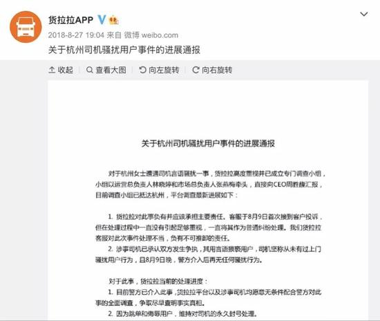 ·货拉拉2018年发布的关于司机骚扰用户事件的说明。