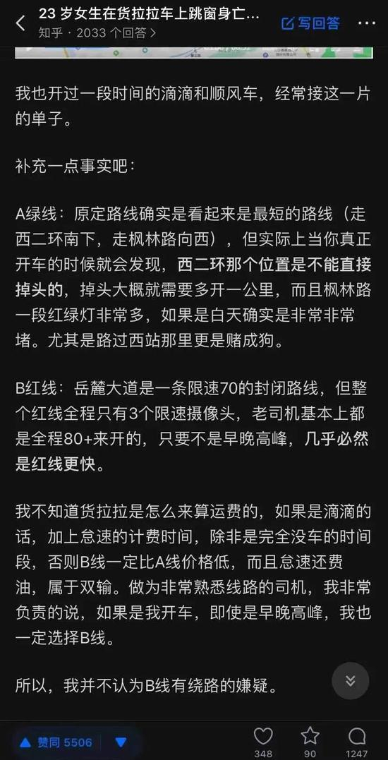 但也有知乎网友“杨子虚”称自己每天上下班都要走这条路线,还在这一片开过滴滴。据其分析,司机是为了不堵车和绕过红绿灯才绕路。“作为非常熟悉线路的司机,我非常负责地说,如果是我开车,即使是早晚高峰,我也一定选择偏航路线。”