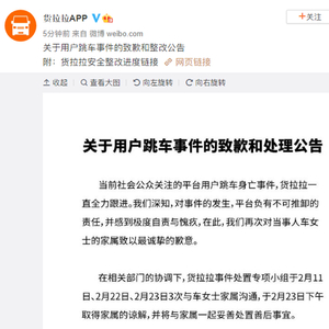 2月24日早间,货拉拉在微博发布关于用户跳车事件的致歉和整改公告,货拉拉表示,“对事件的发生,平台负有不可推卸的责任”。货拉拉称“于2月23日下午取得家属的谅解,并将与家属一起妥善处置善后事宜”。