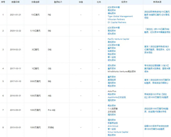 2021年1月,又有消息称货拉拉即将完成15亿美元的F轮融资,本次投资由老股东红杉资本中国和高瓴资本领投,博裕资本、老虎基金、Vitruvian维恩资本、D1 Capital等机构跟投。投后货拉拉估值将达到100亿美元。