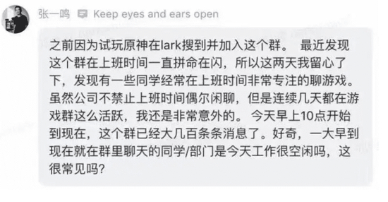 随后, 张一鸣的担忧以更公开的方式表现出来。面对工作时间,字节跳动内部的《原神》游戏兴趣群蹦出几百条信息,张一鸣发出一条疑问:“一大早到现在就在群里聊天的同学 / 部门是今天工作很空闲吗?这很常见吗?”张一鸣“卧底”也释放了一个信号:字节跳动的组织在不停迭代,需要再拧紧一下发条了。