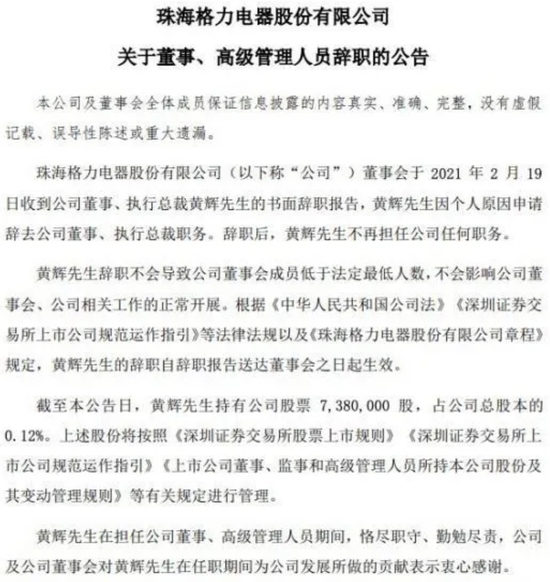 根据格力电器2月21日晚间发布的公告,最有可能成为董明珠接班人的现任公司董事、执行总裁黄辉因“个人原因”申请辞去所有职务。