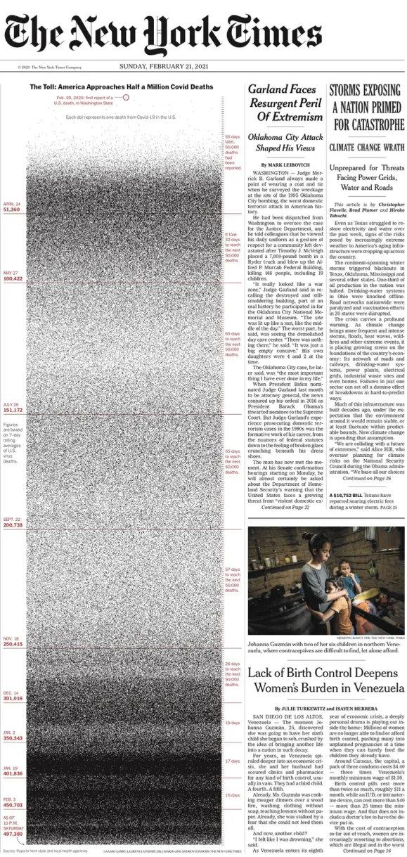 2月21日纽约时报的头版有一张满是黑点的图片。图片的纵向代表疫情发生以来的时间,一个黑点代表一个死于新冠肺炎的美国民众。目前,死于新冠肺炎的美国民众超过50万人。