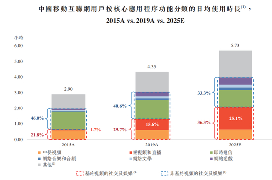 艾瑞咨询报告显示,中国移动互联网用户2015年日均在线时长为2.90小时,2019年提升至4.35小时,预计到2025年将达到5.73小时。在2019年的4.35小时中,大约29.7%的时间用在基于视频的社交及娱乐平台上,预计这一比例到2025年将达到36.3%