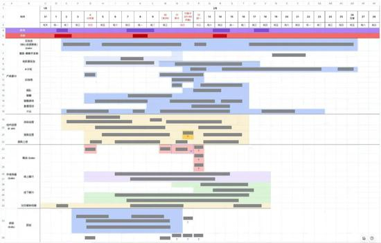 万万给我介绍。你看,这个表格里,每一列就是一天,代表时间的进展。每一行就是一个部门,都有部门对口人被@。