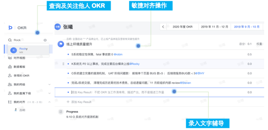 现在,字节跳动已经有10万员工,大家的OKR,都在飞书OKR里面进行对齐。有了飞书OKR,很多OKR相关的功能和场景变得可能。你点击别人的头像,就能看到他的OKR,看到这些OKR和谁相关,以及日常进展等等。