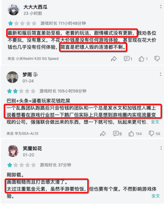 游戏社区充斥着“粗制滥造”“太过注重氪金元素”“游戏体验差”“毁原著”等评论。截止今日,《热血街篮》和《镖人》在TapTap上的评分只剩下4.2分和4.4分(满分十分)。