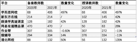 在2019年的跟谁学年报中,跟谁学公司披露,公司共有主讲老师232人,但此次高途课堂的公示显示,备案及授课老师于2020年为128人,2021年为182人,针对这种情况,上述负责人表示,跟谁学包含两大业务品牌,分别是K12业务的高途课堂,和成人业务的跟谁学。年报披露的老师数量为所有业务老师数量总和,而此次监管部门要求的是K12在线教育机构进行老师的教师资格证公示,成人业务不在范围内。此外,公司对主讲老师的上岗有严格要求,需要经过数月的岗前培训,这部分老师也不在此次公示的授课老师范围内。