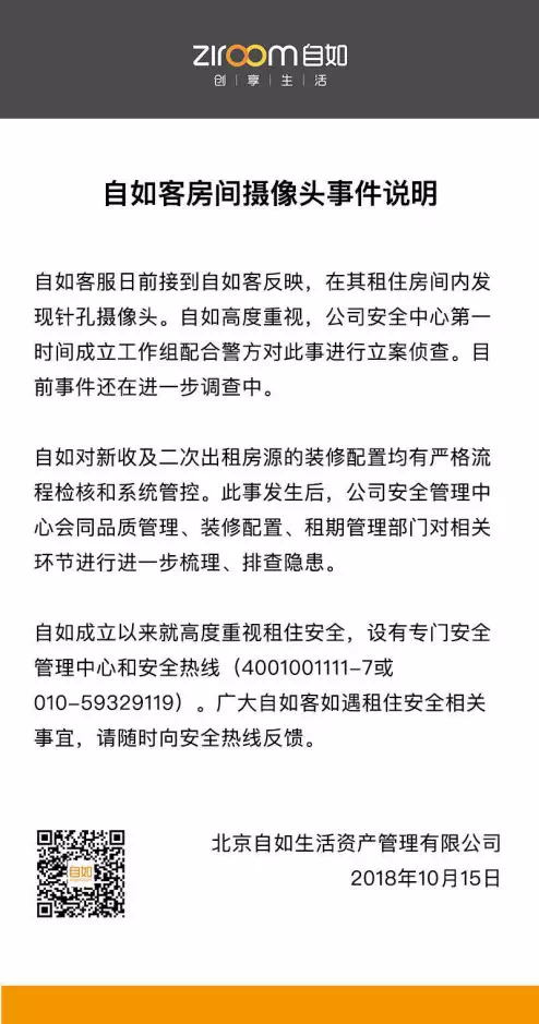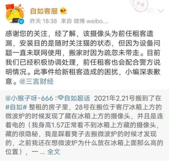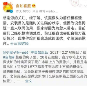 事件在网络上被曝光后,自如客服微博回应称,“该摄像头为前任租客遗漏,安装目的是随时关注猫的状态,但因为设备问题一直未联网使用,搬家时因为疏忽未带走。目前我们已经积极协调处理,前任租客也会配合警方说明情况。”