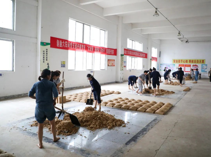 酒曲,是中国传统酿酒工艺特色。工人们在将小麦粉碎后,加入水和母曲进行搅拌,再将其踩成曲坯。酒曲当中的微生物群体,能让白酒进行发酵。酒曲破碎后掺入高粱,可以促进其发酵。