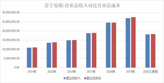 据同花顺iFunD显示,2014年至2020年三季度,苏宁易购净利润分别为8.24亿元、7.57亿元、4.93亿元、40.50亿元、126.42亿元、93.20亿元、-0.75亿元;扣非净利润为-12.52亿元、-14.64亿元、-11.07亿元、-0.88亿元、-3.59亿元、-57.10亿元、-10.08亿元。