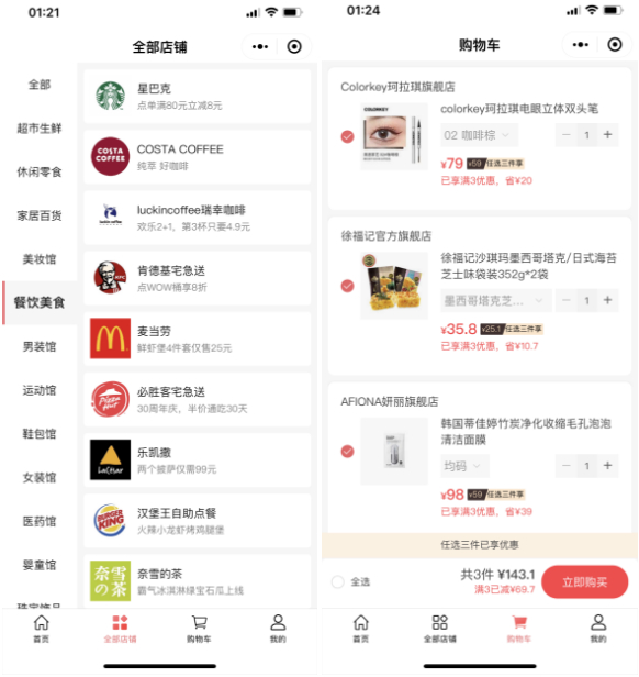 “全部店铺”将大量品牌小程序划分为了超市生鲜、休闲零售、家居百货、餐饮美食以及美妆馆、男装馆、医药馆等类别。而“购物车”,和大多电商平台相似,支持展示商品优惠价、多件满减等操作。