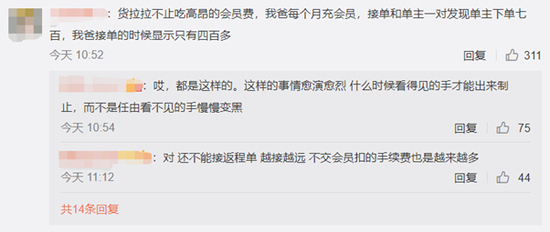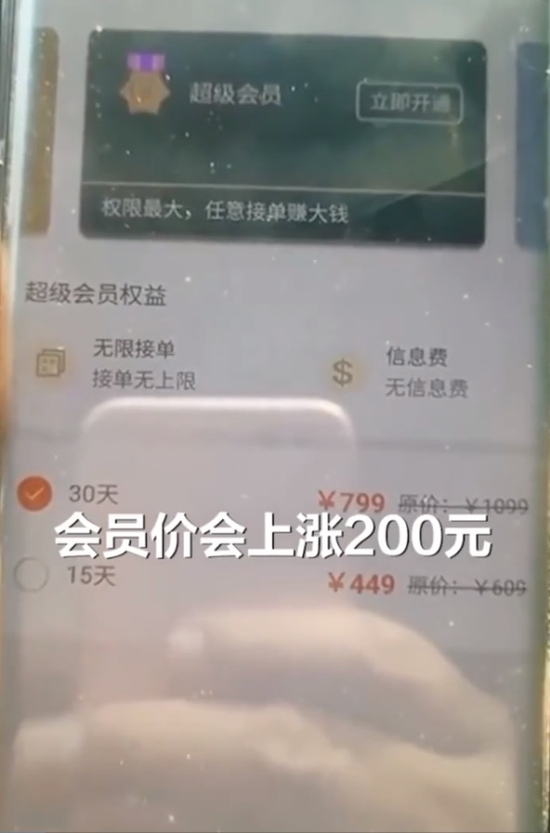 一位长沙地区的货拉拉司机在接受《红星新闻》采访时说:“现在(会员费)是涨价了,(超级会员)709元、高级会员539元一个月。超级会员能无限接单,高级会员只能接5单,就是免那个(抽成)费用,如果没有会员的话,它要抽你15%的信息费,超级会员无限接单,不用抽你的信息费,初级会员是首单不抽信息费,299元一个月。单子一出来是周围的人都在抢的,不是说派给你单的,要是说我开个超级会员709元一个月,你每天固定给我单,那还行。”