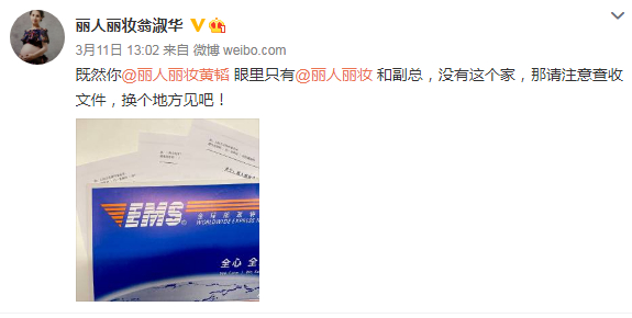 3月11日,“丽人丽妆翁淑华”又发了一条微博:“既然你@丽人丽妆黄韬眼里只有@丽人丽妆和副总,没有这个家,那请注意查收文件,换个地方见吧!”