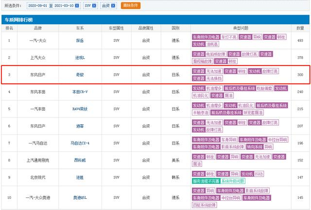 就此,记者也从车质网查询到,有关东风日产奇骏的投诉量惊人,其中2014款车型投诉数量高达1693例,2019款车型投诉数量也高达1617例,问题均以变速器顿挫、无法加速、异响以及漏油为主,此外,该车型还存在大量的有关发动机故障的投诉。此外,从该车投诉量排名可以看到,在最近半年的时间里,有关东风日产奇骏的投诉多达300例之多,排在合资SUV车型投诉榜第3位。