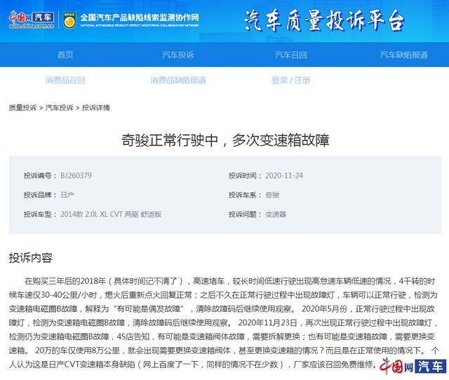 另一方面,经过记者调查,网上存在大量有关奇骏变速箱的故障投诉,车主纷纷表示:“日产奇骏变速箱的故障率太高了!”;“我买来都是严格按照保养手册说的保养。小心翼翼的开,结果还是这样。我们老百姓花几十万买这个车太闹心。强烈要求厂家免费修复延长质保期。”