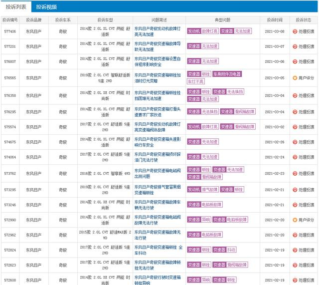此外,还有车主向中国网汽车质量投诉平台投诉了奇骏车型的类似问题,表示自己的2014款奇骏在无任何显示故障码和征兆的前提下,在高速路上突然降速,且加油无力,变速箱不变档,险些发生交通事故。到4s店进行电脑检测后,发现变速箱阀体坏了,但屏幕一直没有出现任何故障码,该车主向记者表示:“(东风日产)厂家推诿不管,这是车辆严重的质量问题,用车安全得不到保证,极易发生交通事故!”并希望:“有关部门能给消费者讨个公道。”