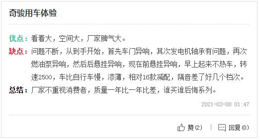 同时,还有奇骏车主表示希望借助投诉平台质问东风日产品牌:“为什么会出现如此严重的故障!到底是车主的运气不好,还是确有品质缺陷,希望厂家能够还原真相!”