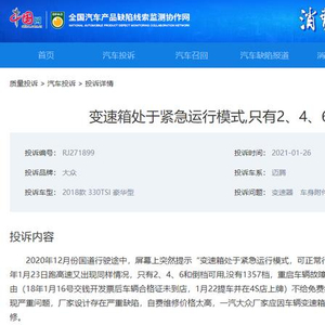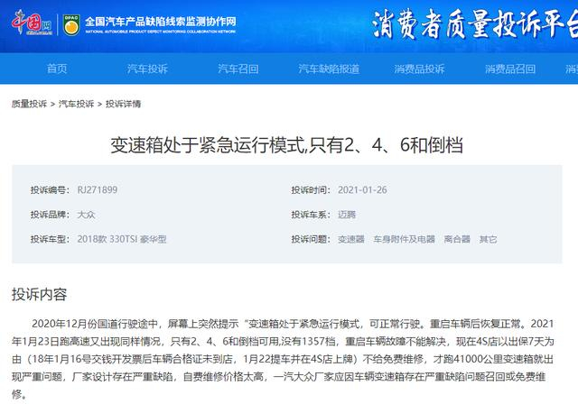 其中一位2018款330TSI 豪华型迈腾车主李先生向记者表示,他于2020年12月份在国道行驶途中,仪表盘屏幕上突然提示“变速箱处于紧急运行模式,可正常行驶”,然后熄火重启车辆后恢复正常。2021年1月23日跑高速又出现同样情况,只有2、4、6和倒挡可用,没有1、3、5、7挡,试图重启车辆来解决问题,但故障没能消除。
