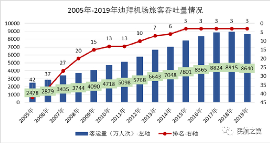旅客吞吐量从2005年的2478万人次增长至2019年8640万人次,全球排名则从42稳居第3位。