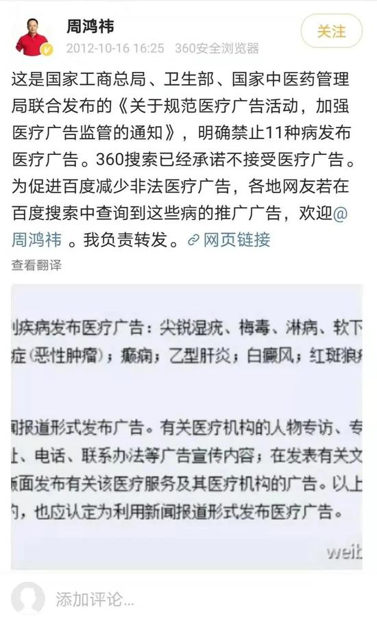一时间,360和百度反复互相指责,周鸿祎隔三差五就会在微博上拿百度的虚假医疗广告说事。