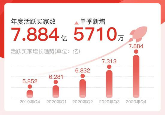 3月17日,拼多多公布财报显示,公司2020年第四季度营收265.5亿元,市场预期192.16亿元,去年同期为107.93亿元。第四季度净亏损13.6亿元,市场预期亏损7.18亿元,去年同期为亏损17.52亿元。2020年全年净亏损71.8亿元,市场预期亏损66.63亿元,2019年同期净亏损69.68亿元。拼多多年活跃买家达到7.884亿,超过阿里巴巴。