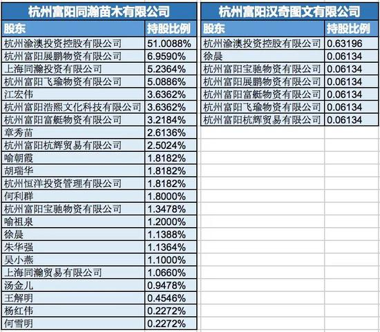 其实并不然。穿透可知,澳海地产的注册资本为6亿元,由富阳市汉奇图文有限公司、富阳市同瀚苗木有限公司各占50%股权。